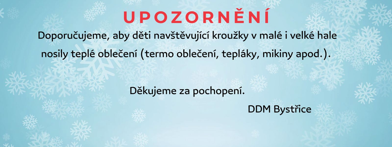 Z technických(důvodů porucha v kotelně ZŠ Bystřice nelze vytápět sportovní haly), jsou tréninky přesunuty do náhradních prostor sportovní haly Gymnázia v Třinci. Děkuji za pochopení Gajdaczová.